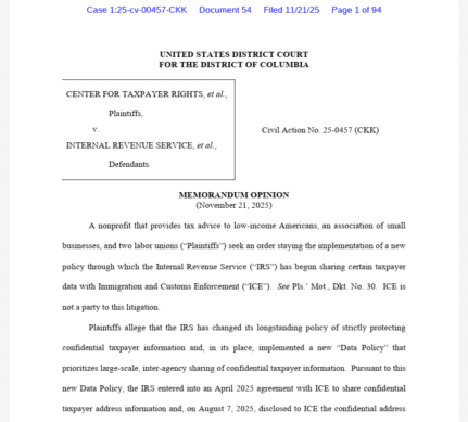 A federal judge has halted the Internal Revenue Service’s practice of sharing confidential taxpayer address information with Immigration and Customs Enforcement, ruling that the data-sharing policy violates federal privacy laws and was implemented unlawfully. U.S. District Judge Colleen Kollar-Kotelly issued a on November 21, granting an injunction in the case Center […]