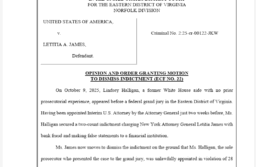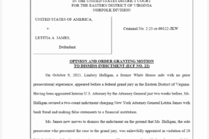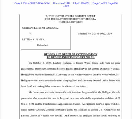 A federal judge on Monday dismissed the criminal indictments against both former FBI Director James Comey and New York Attorney General Letitia James, ruling that interim U.S. Attorney Lindsey Halligan—a former White House aide with no prior prosecutorial experience—was unlawfully appointed in violation of federal law and the Constitution’s Appointments Clause. Senior U.S. District […]