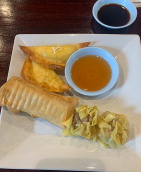 The menu also features several appetizers, such as Crab Rangoon, Eggrolls, and Potstickers. They even have American-style breaded chicken sandwiches.