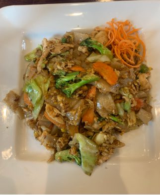 Pad Thai is arguably the most popular and recognizable menu item, but there are other great options to venture out with as well, such as the chicken Pad See Ew pictured below.
