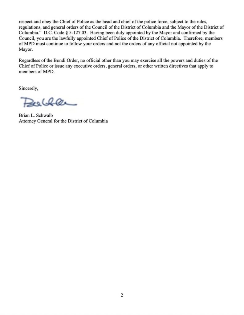 “Therefore, members of MPD must continue to follow your orders and not the orders of any official not appointed by the Mayor,” Schwalb wrote, setting up a direct confrontation over the chain of command.
