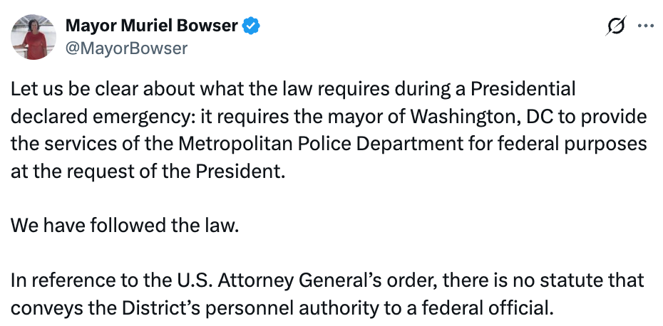 Mayor Muriel Bowser reinforced this position on social media, stating bluntly: “In reference to the U.S. Attorney General’s order, there is no statute that conveys the District’s personnel authority to a federal official.”