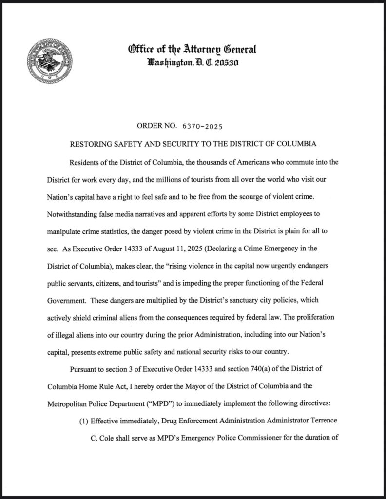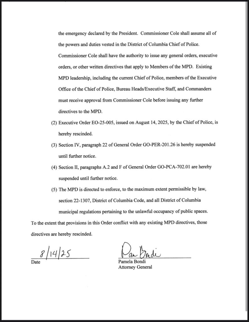 In Order No. 6370-2025, titled “Restoring Safety and Security to the District of Columbia,” Bondi declared that Cole “shall assume all of the powers and duties vested in the District of Columbia Chief of Police”. The order requires that existing MPD leadership, including Chief Pamela Smith, “must receive approval from Commissioner Cole before issuing any further directives to the MPD.”