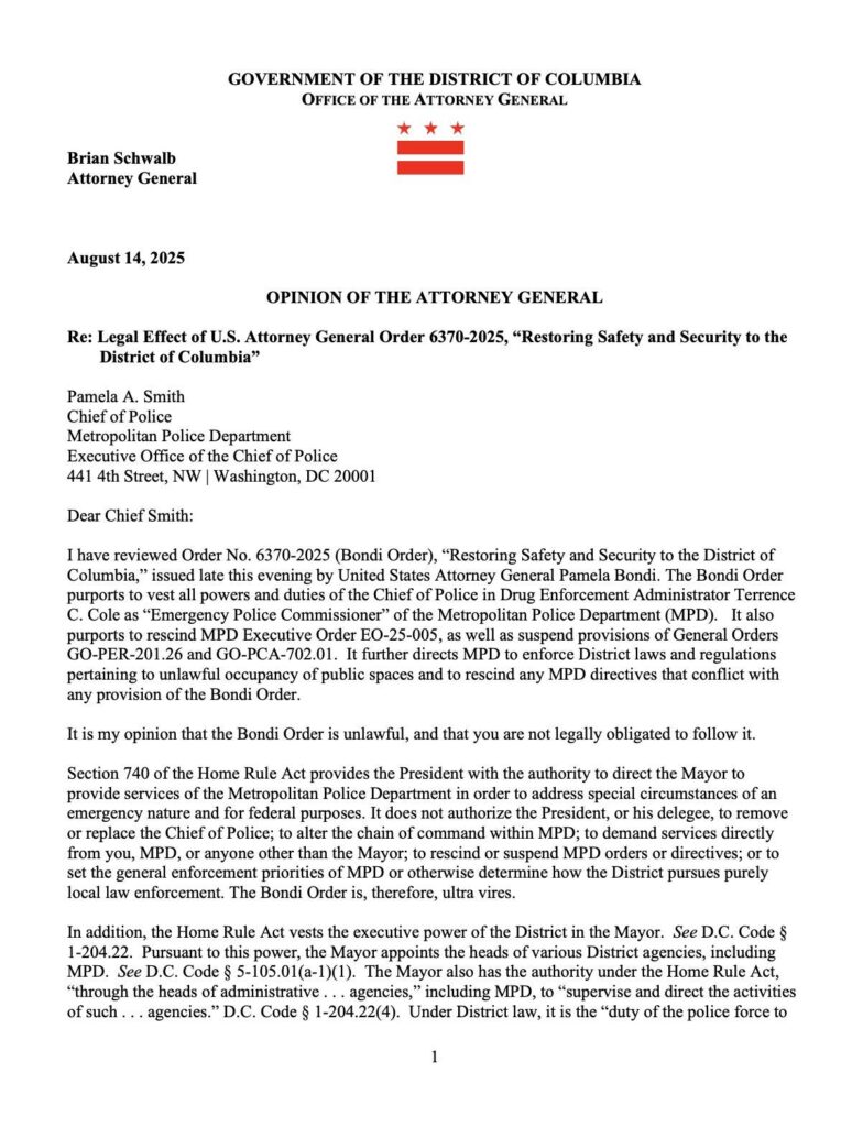 D.C. Attorney General Brian Schwalb responded within hours with a legal opinion addressed to Police Chief Smith, declaring Bondi’s order “unlawful” and advising that Smith is “not legally obligated to follow it.”