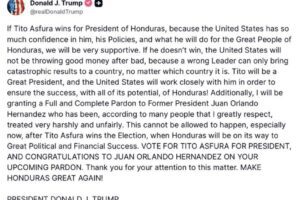 President Donald Trump announced Friday that he will grant a “full and complete pardon” to Juan Orlando Hernández, the former president of Honduras currently serving a 45-year sentence in federal prison after being convicted in 2024 of conspiring to import more than 400 tons of cocaine into the United States. […]