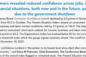 U.S. consumer confidence fell sharply in November, hitting its lowest level since April, as Americans grew more pessimistic about current business conditions, the labor market, and their financial future, according to the latest report from The Conference Board. The Consumer Confidence Index declined by 6.8 points to 88.7 in November, […]