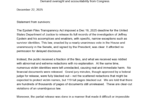 Survivors of Jeffrey Epstein and Ghislaine Maxwell’s sexual abuse issued a letter on Monday accusing the U.S. Department of Justice of violating federal law by failing to release comprehensive investigation records by a congressionally mandated December 19 deadline. The Epstein Files Transparency Act, which passed the House nearly unanimously and […]
