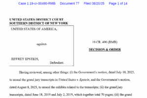A federal judge in Manhattan has rejected the Justice Department’s bid to make public the grand jury materials from the Jeffrey Epstein sex trafficking case. U.S. District Judge Richard Berman issued a 14-page decision on Wednesday denying the government’s request to unseal approximately 70 pages of grand jury transcripts and […]