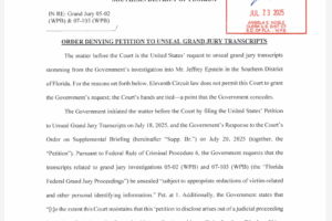 A federal judge in Florida has rejected the Trump administration’s bid to unseal grand jury transcripts from the Jeffrey Epstein investigation. U.S. District Judge Robin Rosenberg of the Southern District of Florida ruled Wednesday that her “hands are tied” by established legal precedent, denying the Department of Justice’s petition to release transcripts […]