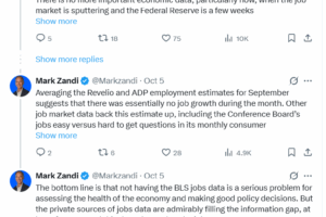 The ongoing federal government shutdown has triggered a major information blackout on the state of the U.S. economy, just when policymakers most need employment data, with economist Mark Zandi warning that, according to alternative indicators, the job market is “weak and getting weaker.” The Bureau of Labor Statistics failed to […]