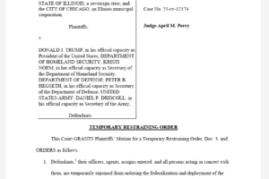U.S. District Judge April Perry granted a temporary restraining order Thursday evening blocking the Trump administration from federalizing and deploying National Guard troops within Illinois. Judge Perry found that the Trump administration failed to meet the legal requirements for deploying federal troops. The order prevents defendants from “ordering the federalization […]