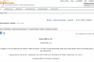 California Governor Gavin Newsom signed the No Secret Police Act (Senate Bill 627) on September 20, making it illegal for federal and local law enforcement officers to conceal their faces with ski masks, balaclavas, neck gaiters, and similar face coverings while conducting official business. The law takes effect January 1, […]