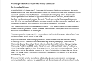 Champaign-Urbana has earned official recognition as a Dementia Friendly community, joining more than 400 communities across 42 states working to better support residents living with dementia and their caregivers. The designation from Dementia Friendly America was announced December 5, marking the culmination of a grassroots effort that began when local […]