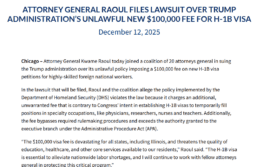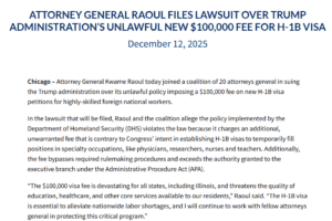 Illinois Attorney General Kwame Raoul has joined a coalition of 20 attorneys general in filing a lawsuit against the Trump administration, challenging a new policy that imposes a $100,000 fee on new H-1B visa petitions. The lawsuit argues that the fee is unlawful, bypasses congressional authority, and threatens critical sectors, […]